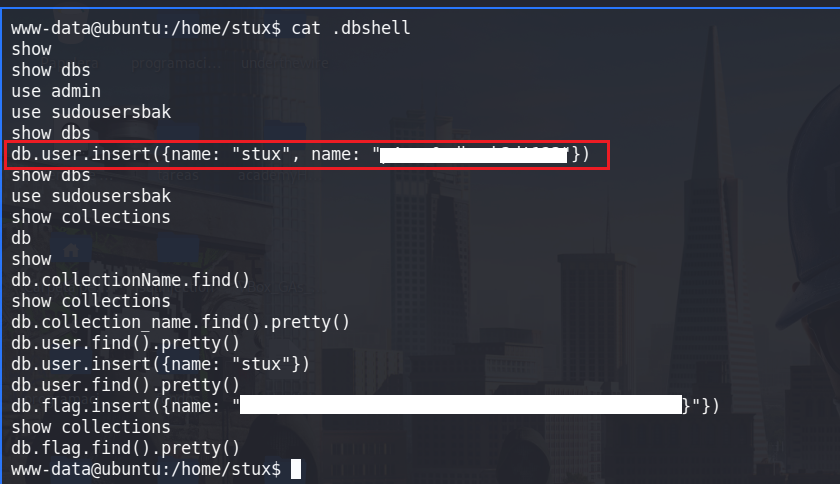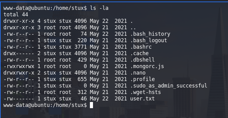 Enumerando los directorios, en /home/stux encontramos un archivo .dbshell